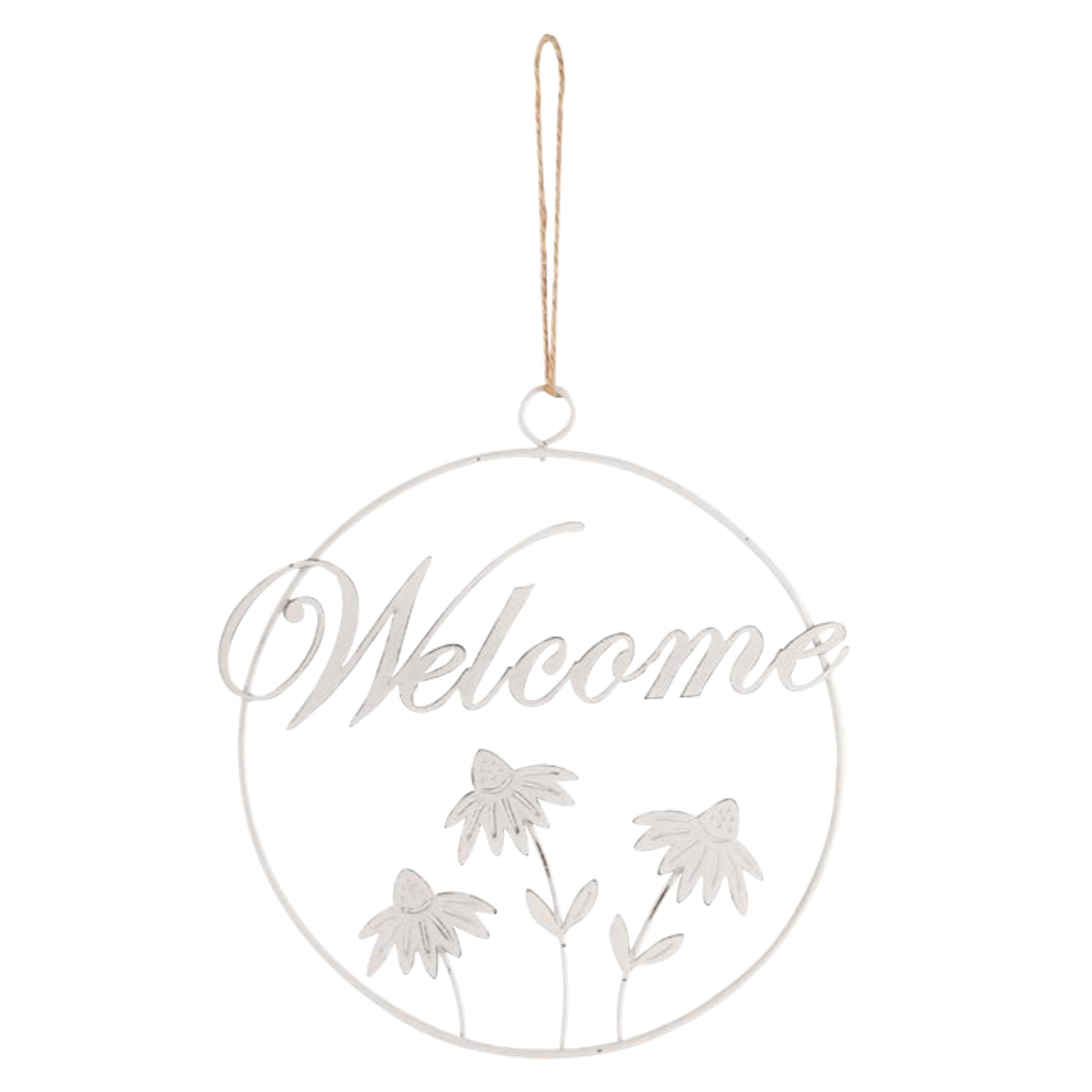 Decorazione da appendere bianca con la scritta "Welcome" in due varianti: soffioni e margherite.
